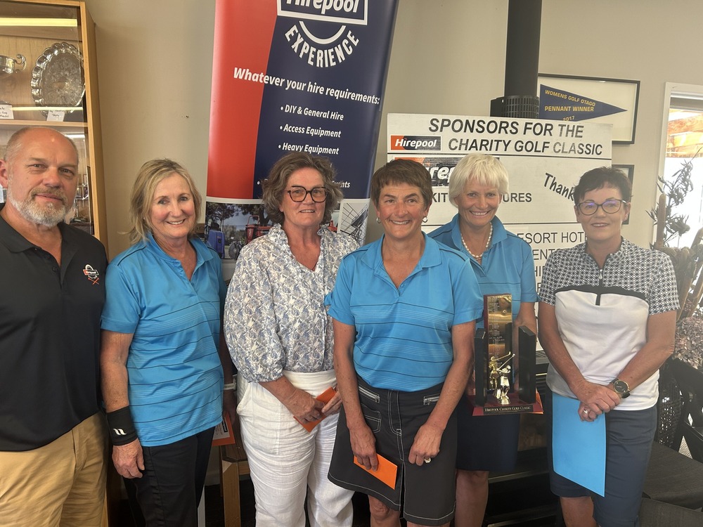 Winners of the women's division of the Hirepool Charity Classic Trilogy 2025, with Grant Pugh from Hirepool. From left: Lyn Hill, Sheryll Emmerson, Judy Nelson, Liz McRae, with Holly Davies ( Wānaka Golf Club Women's Captain).