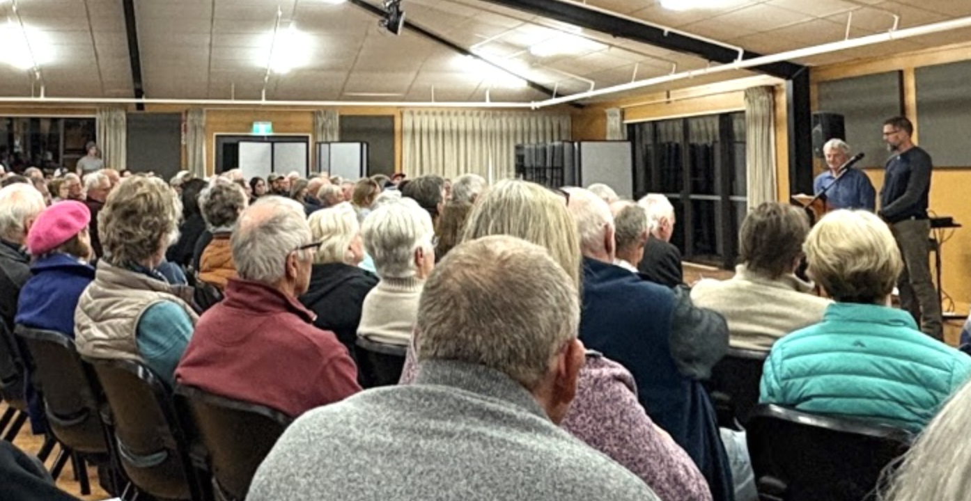Concerned residents filled the Lake Hāwea Community Centre in September to discuss Contact Energy’s fast-track application to reduce the lake level by as much as six metres. PHOTO: Wānaka App
