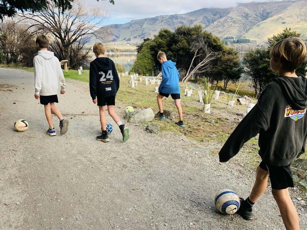 The boys started at the Outlet boat ramp, and each dribbled a football to Wānaka; twice around Pembroke Park, and finally into a goal to mark the 10km mark.