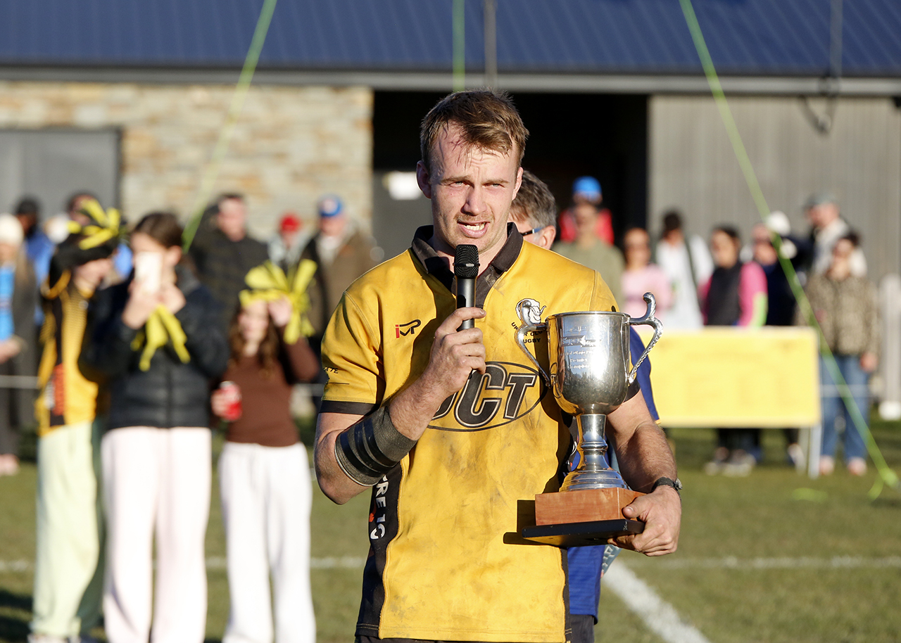 Upper Clutha captain Lachie Garrick accepting the trophy.