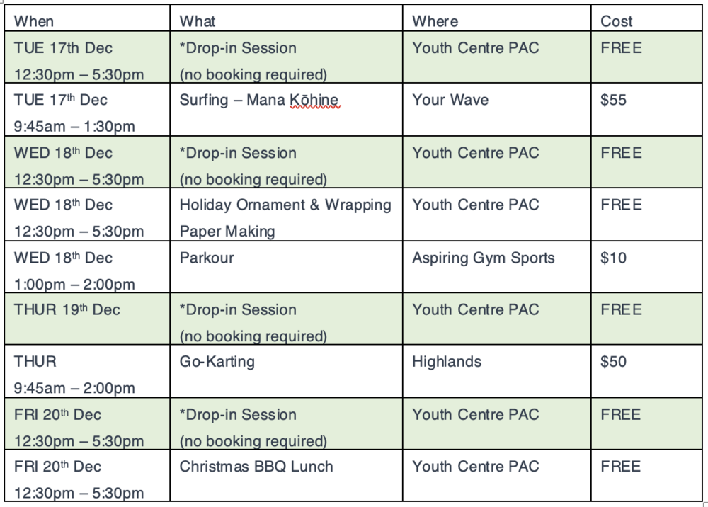We are stoked to run drop-in sessions these Summer Holidays from our new Youth Centre located within Paetara Aspiring Central. Our Youth Centre has all the fun stuff like, a cool pool table, air hockey table, creative arts and crafts, music gear, supervised gaming stations and an outdoor chill space. All drop-in sessions are free for youth aged 11yrs+ to come along and hangout and are supervised by Youth Workers. No bookings required.
