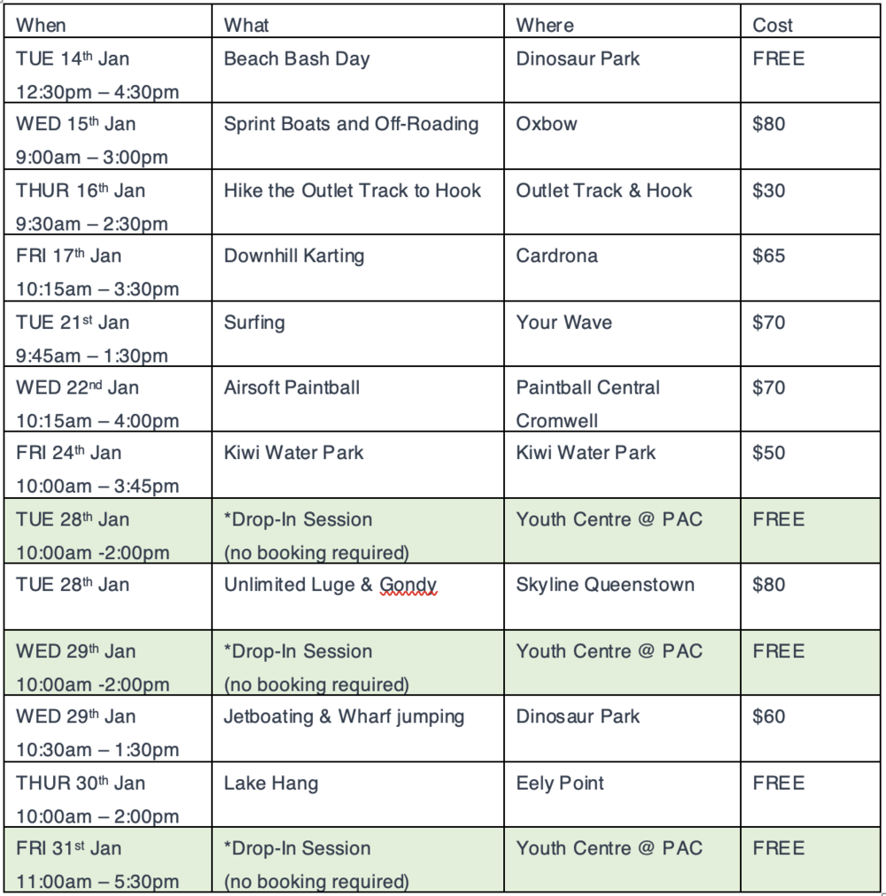 There’s something for everyone, with activities including; softair paintball, Highlands, hiking, QT adventures, Kiwi Waterpark and much more. Activities are supervised by Youth Workers and are planned for youth aged 11yrs+.