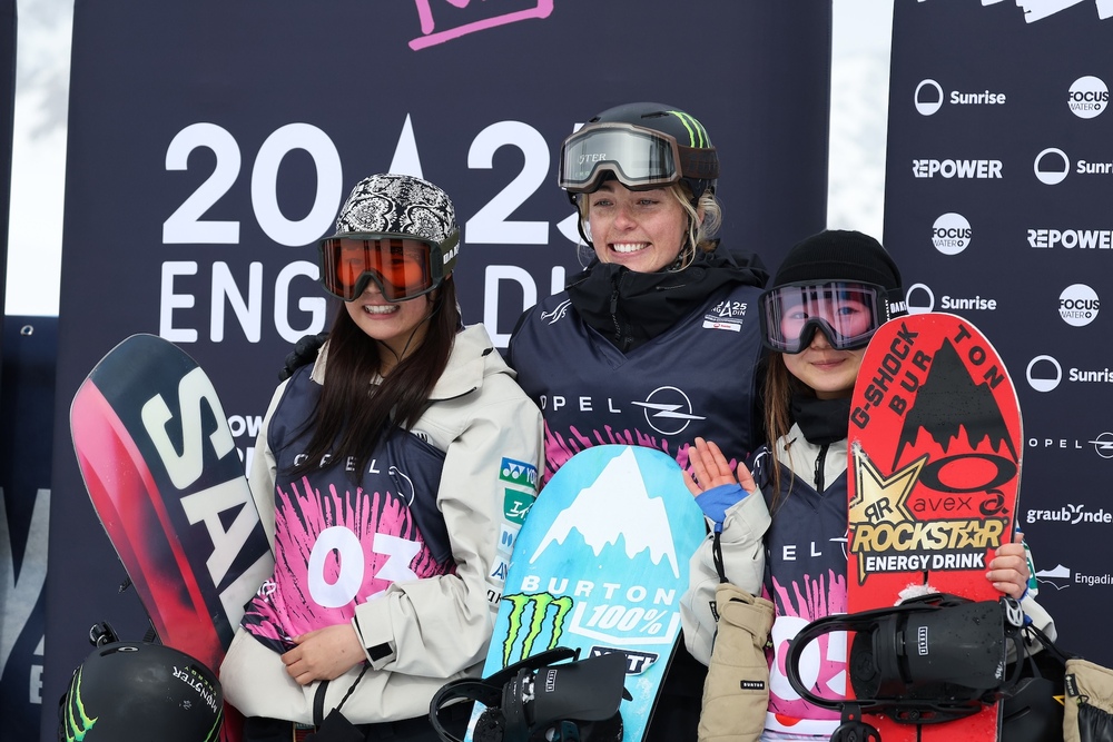 2025 Women’s FIS Snowboard Slopestyle World Championship podium. [L-R] Kokomo Murase (JPN) 2nd, Zoi Sadowski-Synnott (NZL) 1st, Reira Iwabuchi (JPN) 3rd.